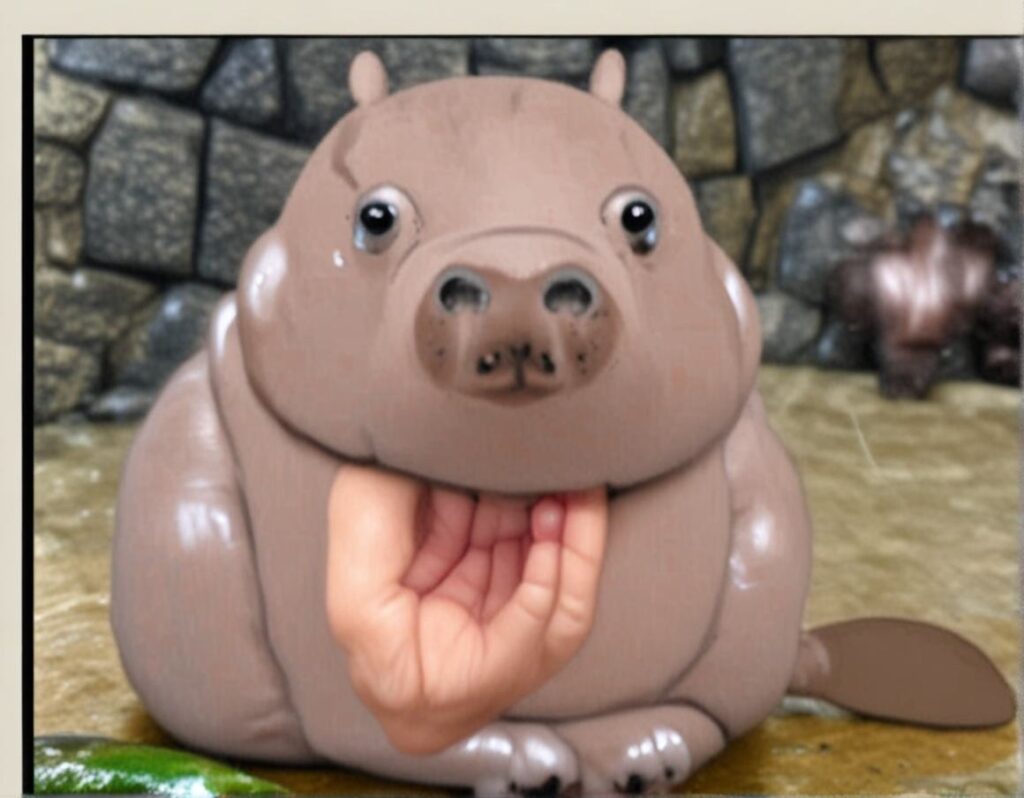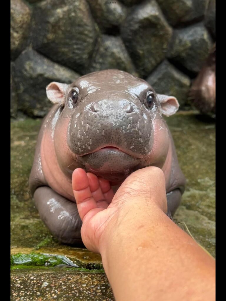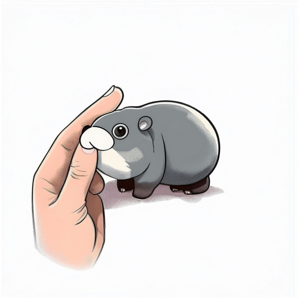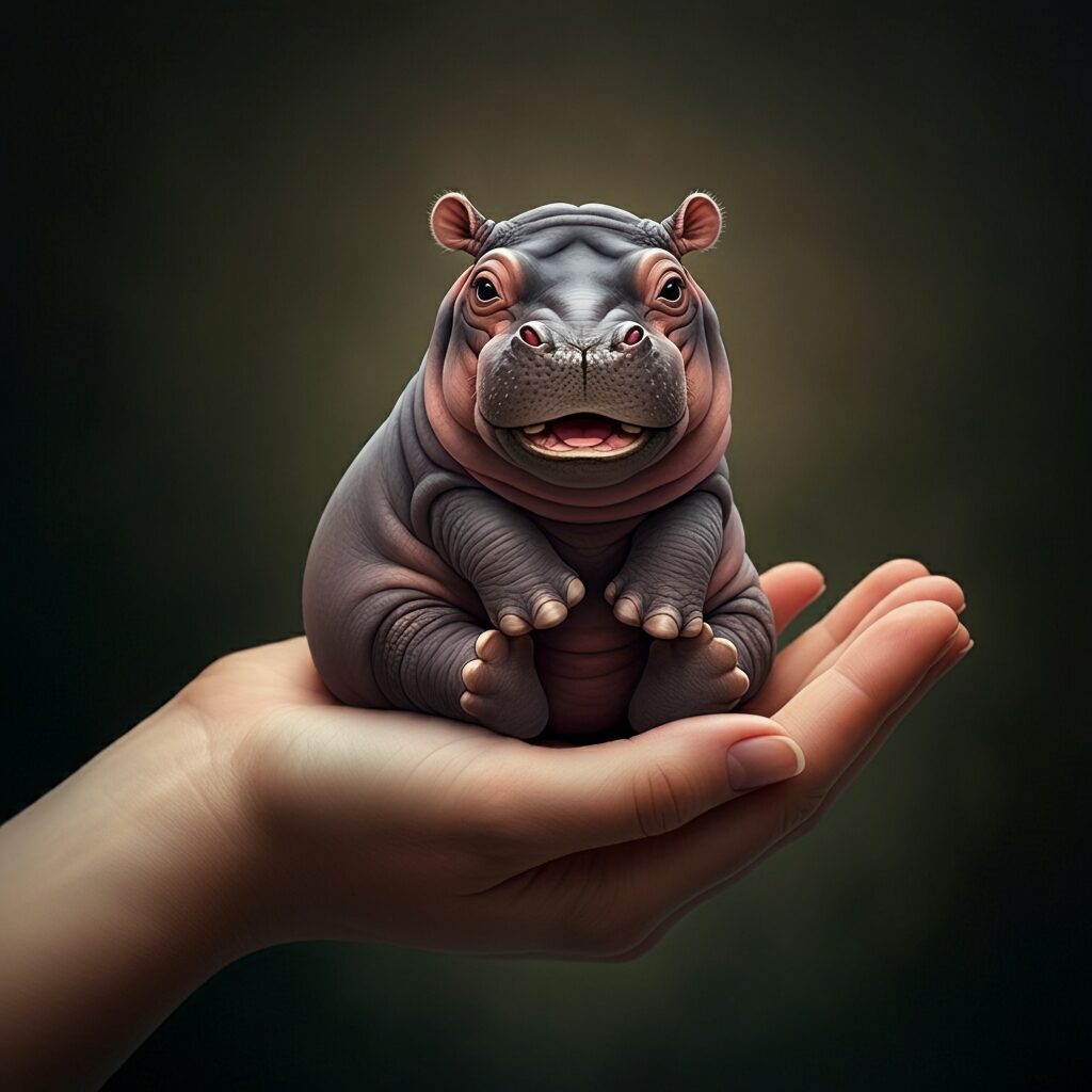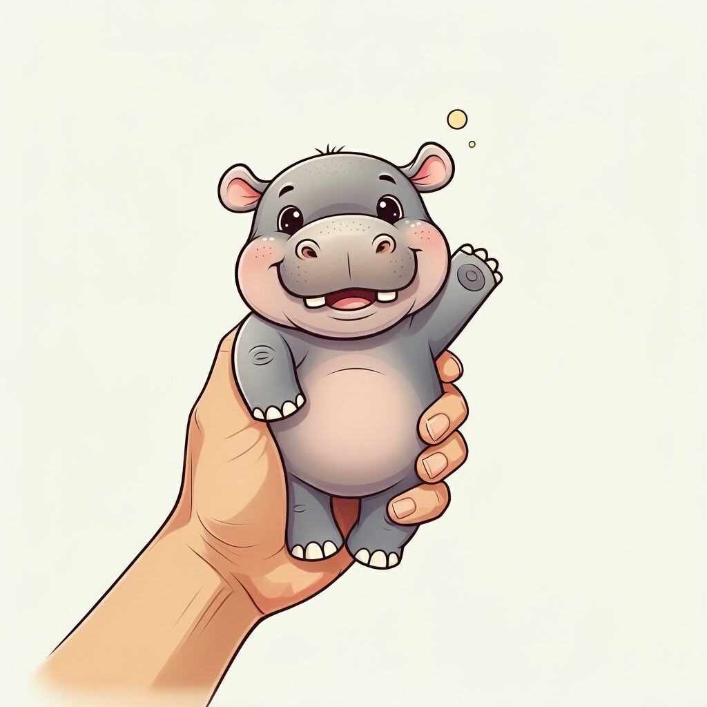 A hippopotamus in your hand, cute , smiling , very small , reaching out with all your might, manga small